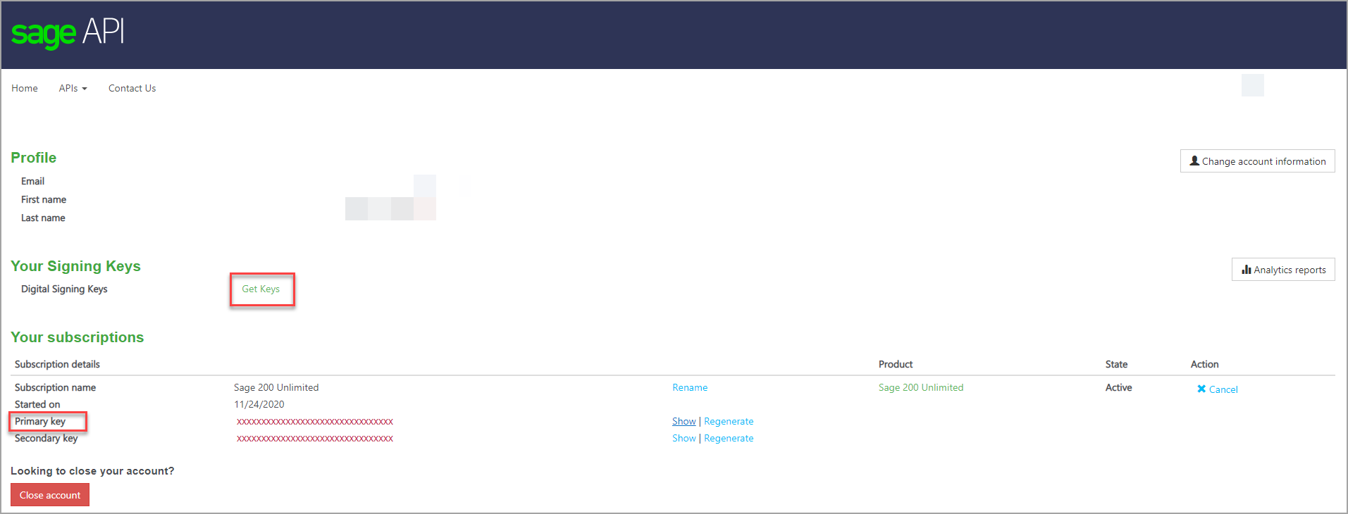 - Retrieve subscription key by subscribing to the Sage 200 APIAPI A set of rules and protocols that allows different software applications to communicate with each other. Codat provides APIs for accessing financial data from accounting, banking, and commerce platforms. on the Sage 200 API page for developers.